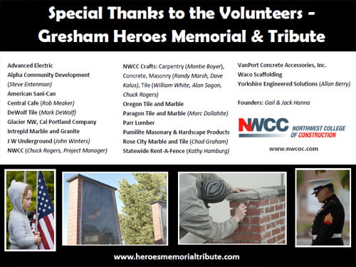 In 2008/2009, The Northwest College of Construction was proud to be a part of the construction efforts, in cooperation with local suppliers and contractors, to build the Gresham Heroes Memorial.
